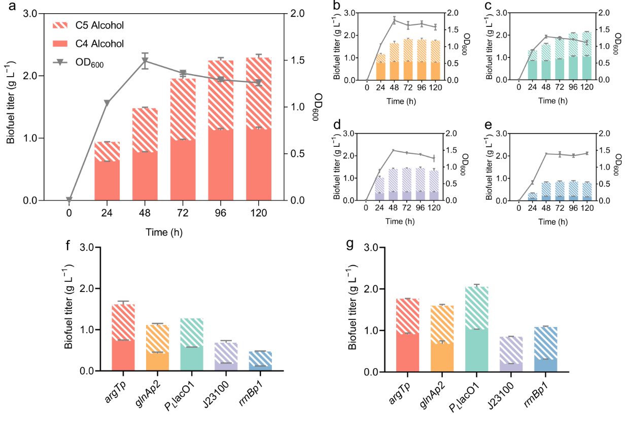 本文第一作者马晓焉副研究员和博士研究生马炼杰聚焦利用转录调控手段提升细胞工厂鲁棒性的研究,取得了一系列的研究进展。在全局调控层面,建立了σ54型RNA聚合酶驱动的合成途径持续表达系统,解决了σ70型全酶在生长稳定期和胁迫条件下的供应不足问题,实现了合成途径的自响应、自激活和自强化,对低pH、高渗透压等胁迫条件表现出较好的抵御能力,成功实现了跨越整个生长期和胁迫条件下的高效生物合成。以σ54依赖型启动子驱动高级醇的生物合成,高级醇产能在进入菌体生长稳定期后持续加强,产量达到常用σ70依赖型启动子的3倍(Biotechnol Biofuels. 2020, 13:29)。