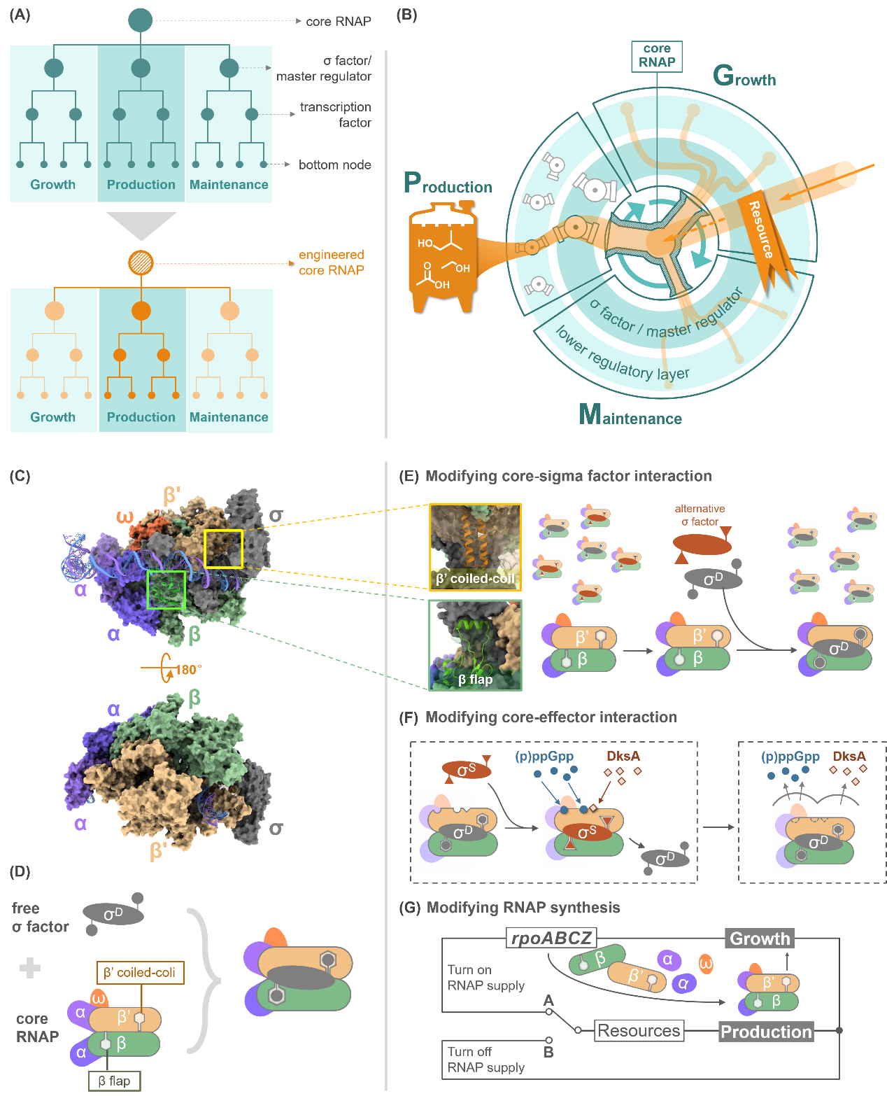 RNAP核心酶类似于一个多通阀,负责控制资源向增长、维护和生产三个模块的分配。为了构建具有鲁棒性的微生物细胞工厂,可以自上而下地对基因调控网络进行改造,从最上层的RNAP核心酶到σ因子和全局转录因子,再到更下层的功能基因,以实现细胞资源的整体重分配和局部精准引导(图1B)。综述通过分析RNAP核心酶结构的最新研究进展(图1C),针对核心酶与σ因子结合的两个主要区域(β'亚基的coiled-coil结构域和β亚基的flap结构域)(图1D),论述了三种调节全酶中的σ因子分布的不同策略,包括改变RNAP核心酶上与σ因子的相互作用的关键区域(图1E)、改变RNAP核心酶与效应因子之间的相互作用(图1F)、控制RNAP 核心酶的合成以实现资源分配在生长(A通路)和生产(B通路)之间的切换(图1G),从而最终可以通过工程式改造RNAP核心酶(斜线填充)实现全局转录调控网络的重编程,加强与生产相关模块(深橙色)的表达(图1A)。