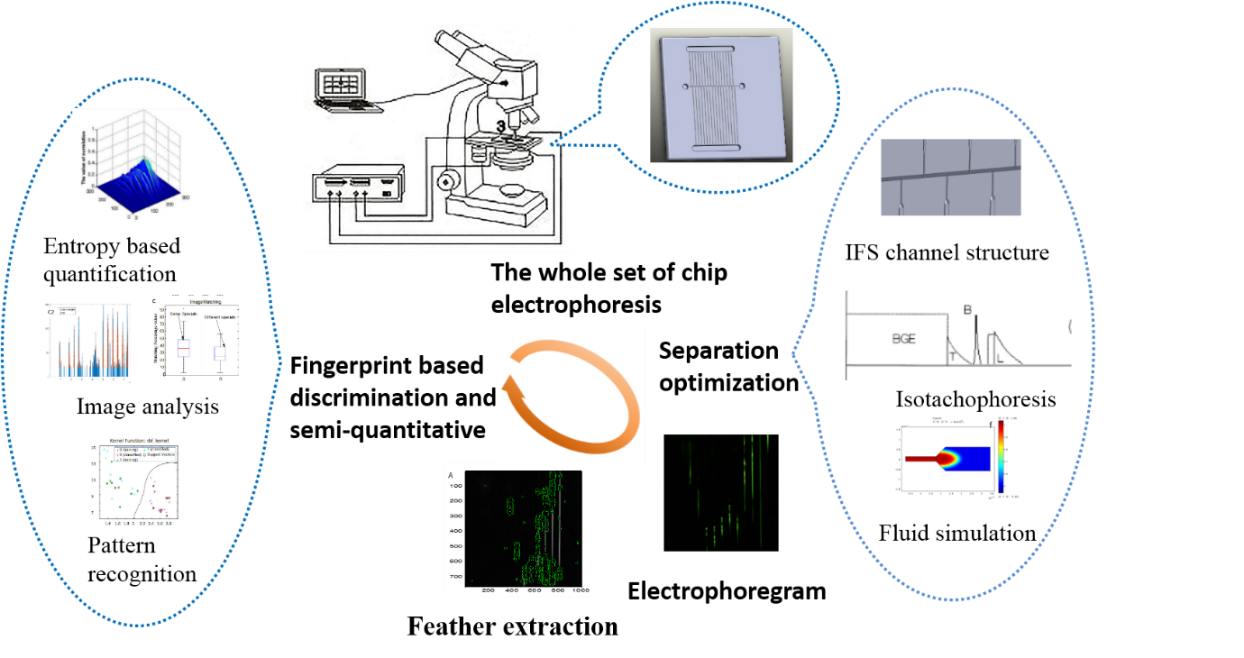 近些年来,针对新发和突发传染病爆发,未知、部分未知以及不断突变病原体的快速检测是及时发现和有效控制传染病疫情的关键之一,课题组利用微流控芯片的高效和集成化优势,并借助计算机流体动力学模拟仿真,实现了微生物细胞全蛋白微流控芯片多维高通量高分辨电泳分离。进一步分别利用了基于尺度不变特征变换算法的图像特征提取,全局信息熵和支持向量机等图像分析技术解析精细电泳分离指纹图谱,实现了混合样品中未知微生物的鉴别和半定量分析。(http://doi.org/10.1016/j.chroma.2021.462797)