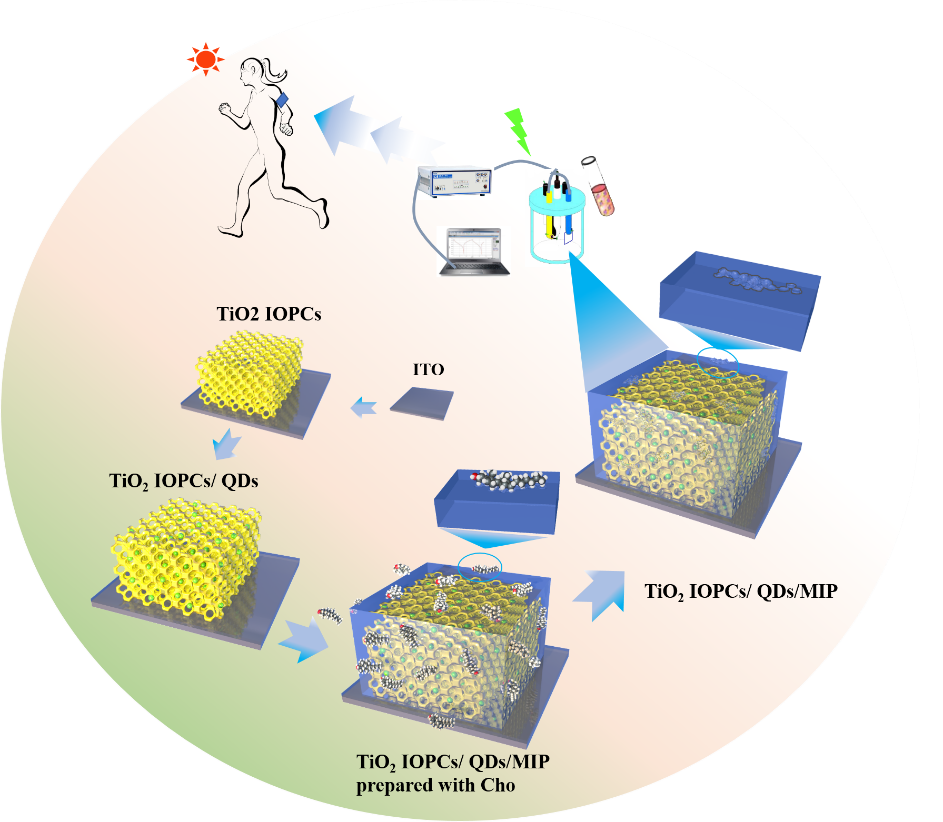柔性可穿戴智能化健康监测装置离不开生物传感器技术的发展。光电化学(PEC)传感器具有成本低、仪器简单、易于小型化和高灵敏度的优势。有机/无机杂化和无机钙钛矿新型纳米材料因其具有载流子迁移率高、直接带隙结构、光电转换效率高等优异的光电性能,在多个领域备受关注。本课题组采用二氧化钛反蛋白石/钙钛矿量子点异质结,同时包裹高选择性分子印迹聚合物层的策略,不仅建立了能够应用于水溶液样品检测的钙钛矿生物传感器,而且实现了血样中胆固醇的高选择性检测(http://doi.org/10.1016/j.bios.2022.114112) (http://authors.elsevier.com/tracking/article/details.do?aid=132121&jid=SNB&surname=Lina)。在此工作基础上,本团队将进一步开展汗液中未知目标的检测,以建立新型可穿戴智能健康监控装置。
