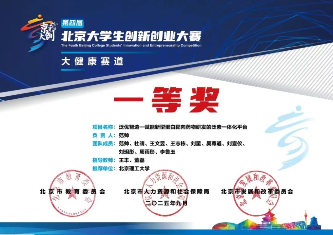 项目“泛优智造---赋能新型蛋白靶向药物研发的泛素一体化平台”,大健康赛道一等奖。