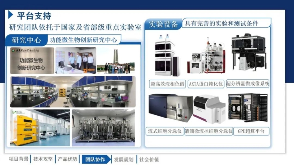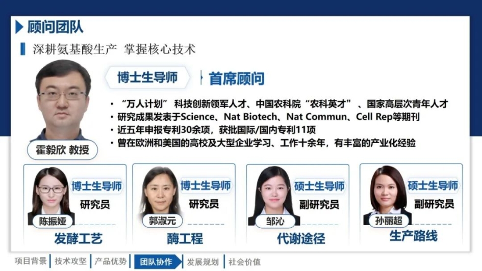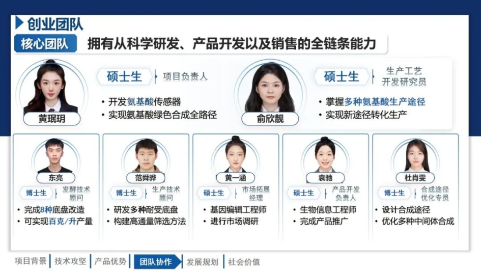 团队得到生命学院霍毅欣教授(国家级领军人才、国家高层次青年人才)和陈振娅研究员、郭淑元研究员、邹沁副研究员、孙丽超副研究员等深耕氨基酸生产与酶工程领域的资深专家的精心指导。团队依托国家级及省部级重点实验室、功能微生物创新研究中心,配备超算平台、超高效液相色谱、液滴微流控细胞分选仪等先进研发设备,具备强大的技术研发和产业化推进能力。项目已完成小试,正积极推进中试,展现出良好的发展前景。