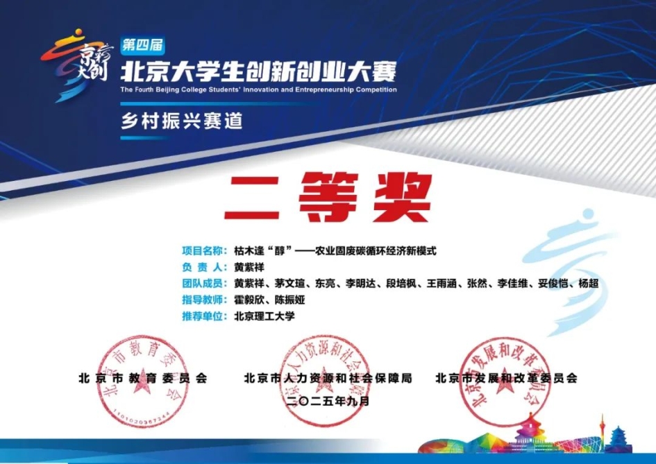 项目“枯木逢“醇”——农业固废碳循环经济新模式”,乡村振兴赛道,二等奖。