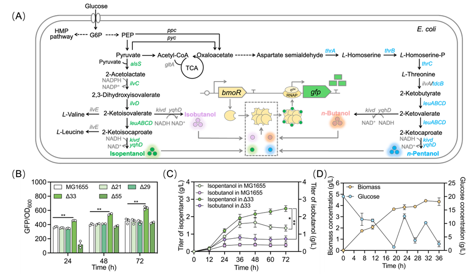通过对这三个关键区域进行半理性设计,成功实现了BmoR对同分异构体和结构类似物的严格区分。本研究通过测定BmoR与信号分子间的亲和力进一步证明了BmoR突变体对正戊醇或异戊醇的严格特异性响应。通过模拟分析BmoR突变前后六聚体结构的变化揭示了影响BmoR识别信号分子的关键残基。随后,利用对异戊醇严格特异性响应的生物传感系统,该工作成功筛选到一株异戊醇高产菌株,实现12.6 g/L异戊醇的生物合成,为迄今为止的最高产量。该方法将机器学习与分子模拟相结合,以优化转录因子改造工程,展示了解决转录因子的信号分子滥交,并提高了生物传感器的检测精度。